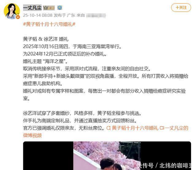 据“一丈凡尘”等网友爆料,黄子韬与徐艺洋的婚礼以“海洋之星”为主题,这是两人2024年12月领证后补办的仪式。 没有传统接亲环节,换成了亲友自由社交的派对模式,甚至会用 “新郎手持+新娘头戴微摄”的双视角全程直播,打赏收入全捐癌症患儿救助机构 。 更受关注的是嘉宾名单:网传鹿晗已确认到场,可曾同属EXO的其他成员却毫无动静。